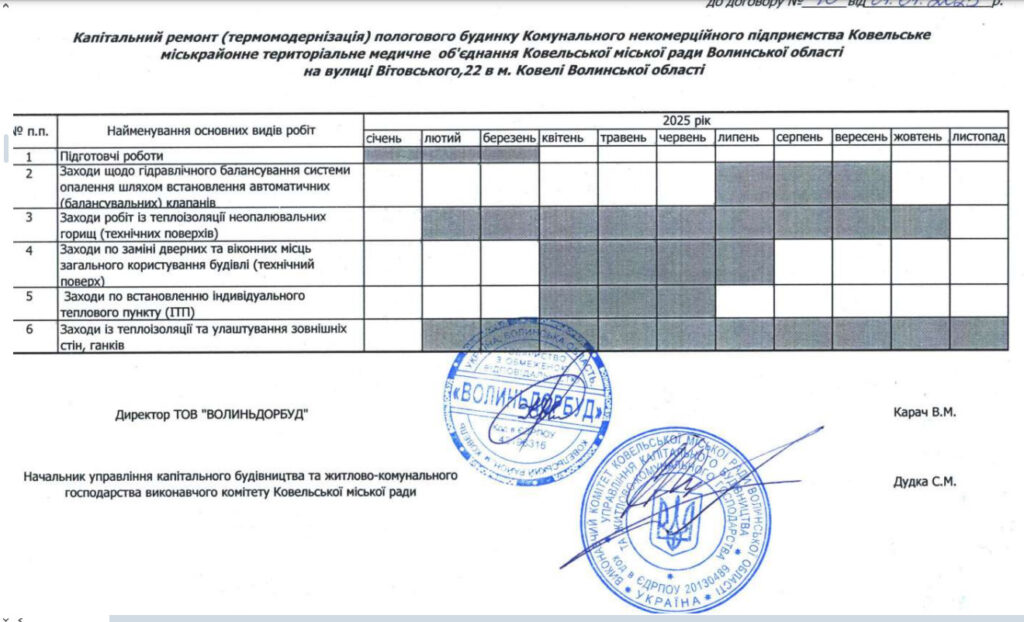 Договір підряду сторони підписали 1-го січня 2025 року. Згідно з документом, ТОВ «Волиньдорбуд» до початку грудня 2025-го має налагодити систему опалення, встановити індивідуальний тепловий пункт та утеплити приміщення медустанови.