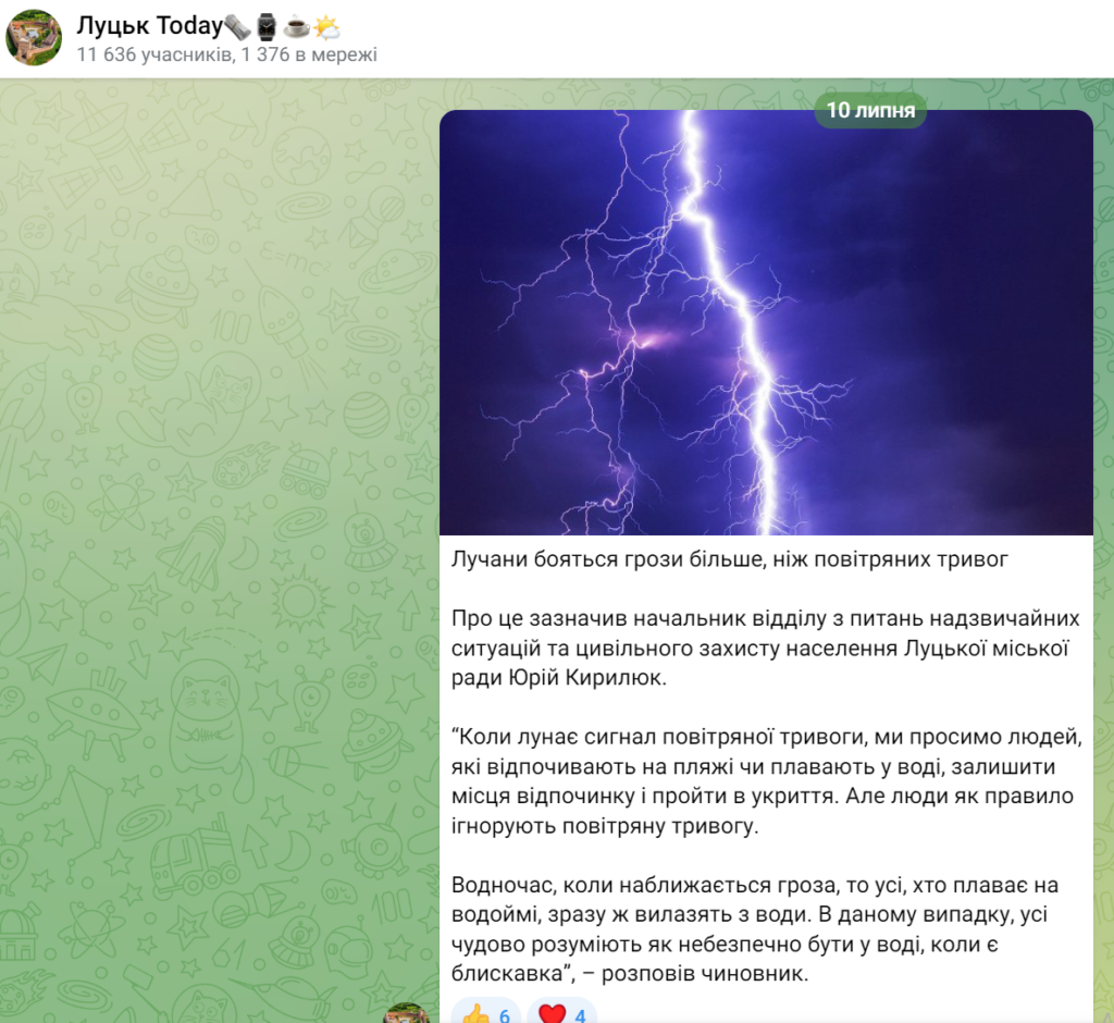 Загалом за період моніторингу в ньому опублікували 13 повідомлень. В дописах ми знайшли маніпуляції, зокрема, про те, що лучани бояться грози більше, ніж повітряних тривог.
