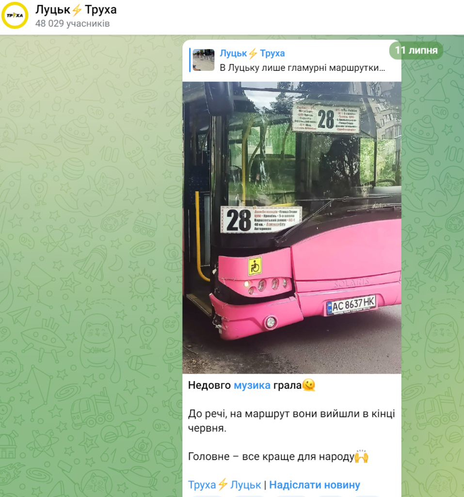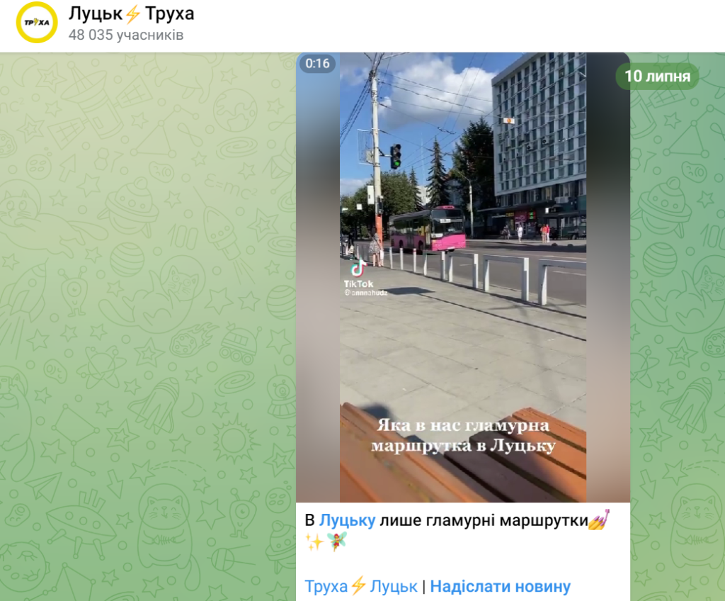 Перша публікація у пабліку з’явилася 2 серпня 2022 року. Всього за період аналізу на каналі опублікували 76 повідомлень. Повідомлення тут бувають неточні і маніпулятивні. Наприклад, як тут: «В Луцьку лише гламурні маршрутки». Адже в Луцьку є наразі лише одна рожева маршрутка. Автобус часто фотографують та знімають в стилі фільму «Barbie».