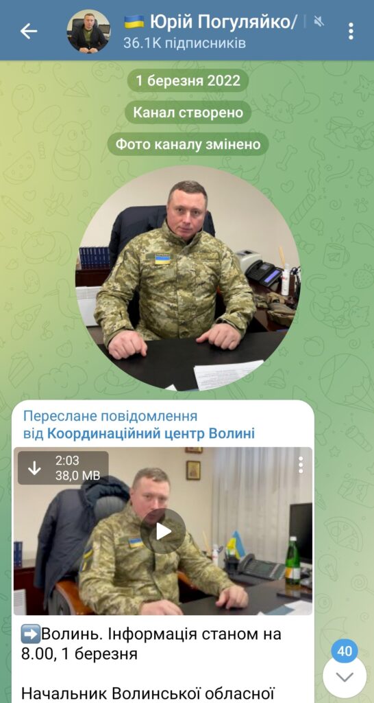 Телеграм-канал голови Волинської ОДА Юрія Погуляйка (36 250 підписників)