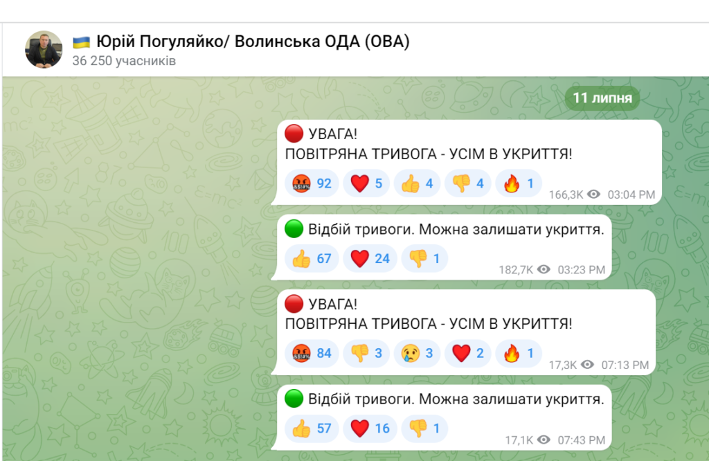 Цей канал інформативно повідомляє про початок і завершення повітряних тривог на Волині. За період моніторингу всього було 10 повідомлень (включаючи інформацію про початок та відбій тривоги, – авт.).