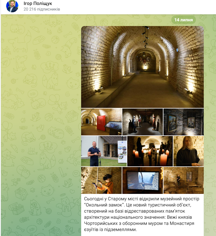 За період аналізу було всього лише два дописи на сторінці мера Луцька. Одне повідомлення про те, що 14 липня у Луцьку відбулось відкриття музейного простору «Окольний замок» у старому місті. Це новий туристичний об’єкт, створений на базі відреставрованих пам’яток архітектури національного значення: Вежі князів Чорторийських з оборонним муром та Монастиря єзуїтів із підземеллями.