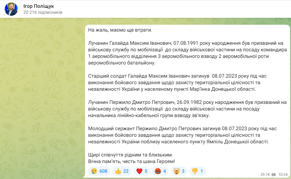 Інше повідомлення стосувалось смерті загиблих бійців. Луцький міський голова писав про нові втрати українських військових, які родом з Волині і загинули на війні.