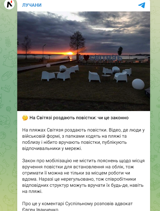 Також у пабліку є новина про те, що на Світязі роздають повістки з поясненням юриста, що це законно. Новина скопійована із «Суспільного.Луцьк».