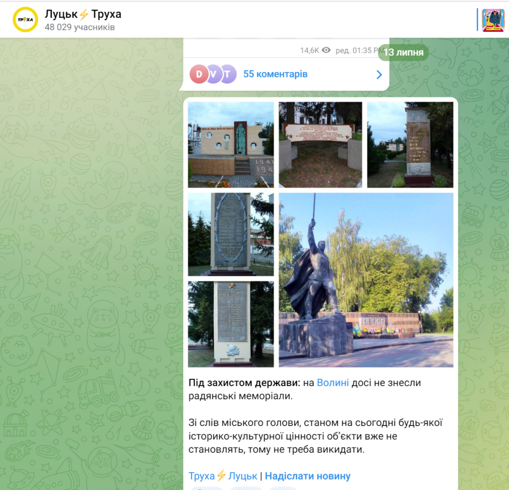 Ще була публікація про блогера-лучанина, який робить алкостріми та збирає гроші в рублях. На цьому пабліку є критика мера Луцька Ігоря Поліщука, зокрема, про досі не знесені радянські меморіали в місті.