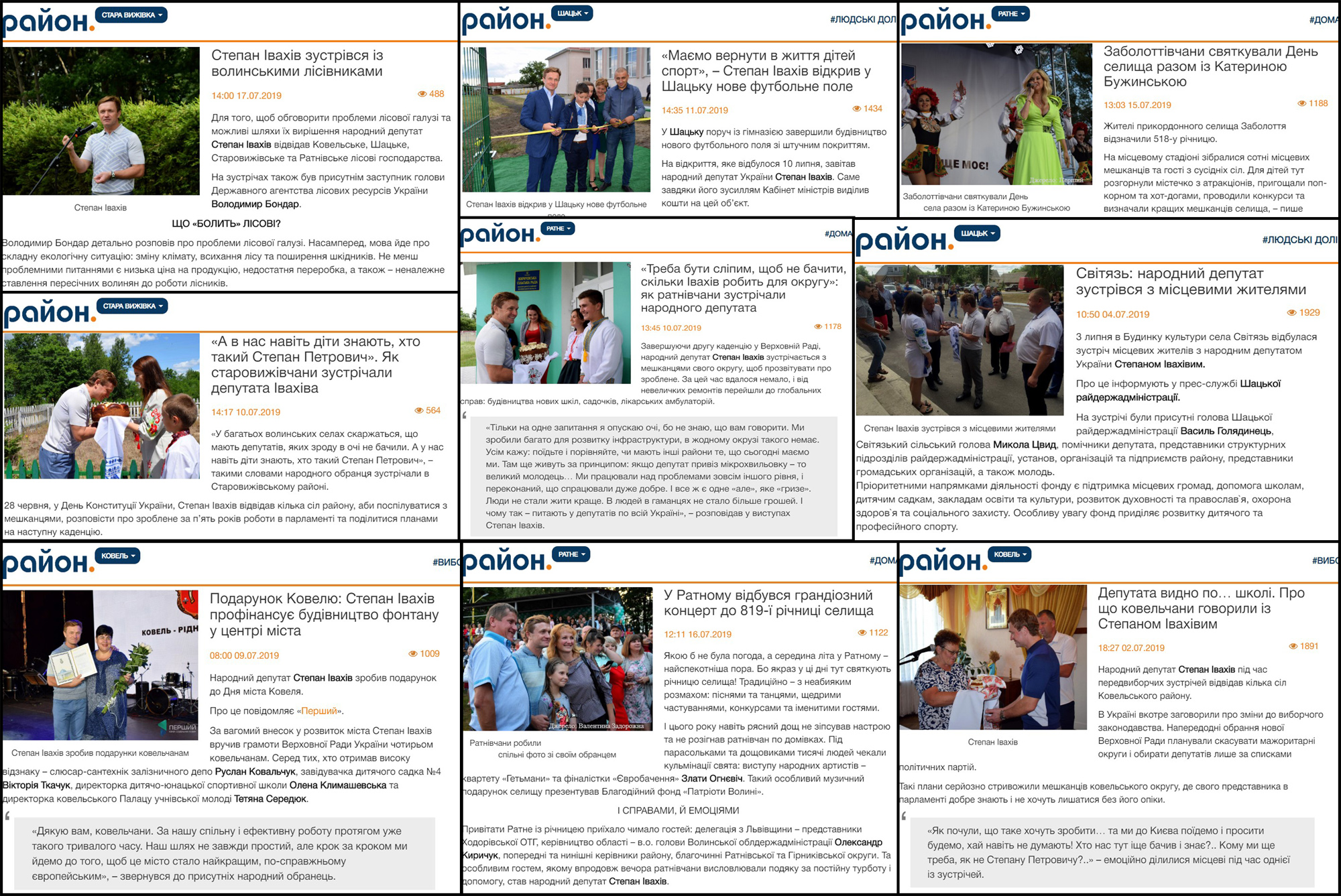 Аналогічна неузгодженість і з рекламними матеріалами на сайтах мережі «Район». «Сила правди» нарахувала там 16 матеріалів за передвиборчу кампанію без належного маркування, але з ознаками реклами на користь кандидата Івахіва. В інших волинських округах за рекламні матеріали на сайтах мережі «Район» кандидати офіційно платили від 3 до 8 тисяч гривень. Судячи з таких розцінок, щонайменше 45 тисяч гривень оминули фінзвіт кандидата.