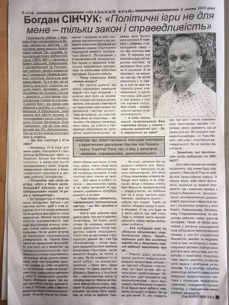 Адвокат-«батьківщинівець» Богдан Сінчук теж не сильно витрачався на виборчу кампанію: 11 тисяч на поліграфію, 28 тисяч – на рекламу в газетах і 7 тисяч на мережу сайтів «Район». Ось і увесь бюджет. Та, оскільки «Батьківщину» на Волині виборці поважають, у нього – третє місце за результатами голосування (8,64%). Один голос обійшовся у 7 гривень.