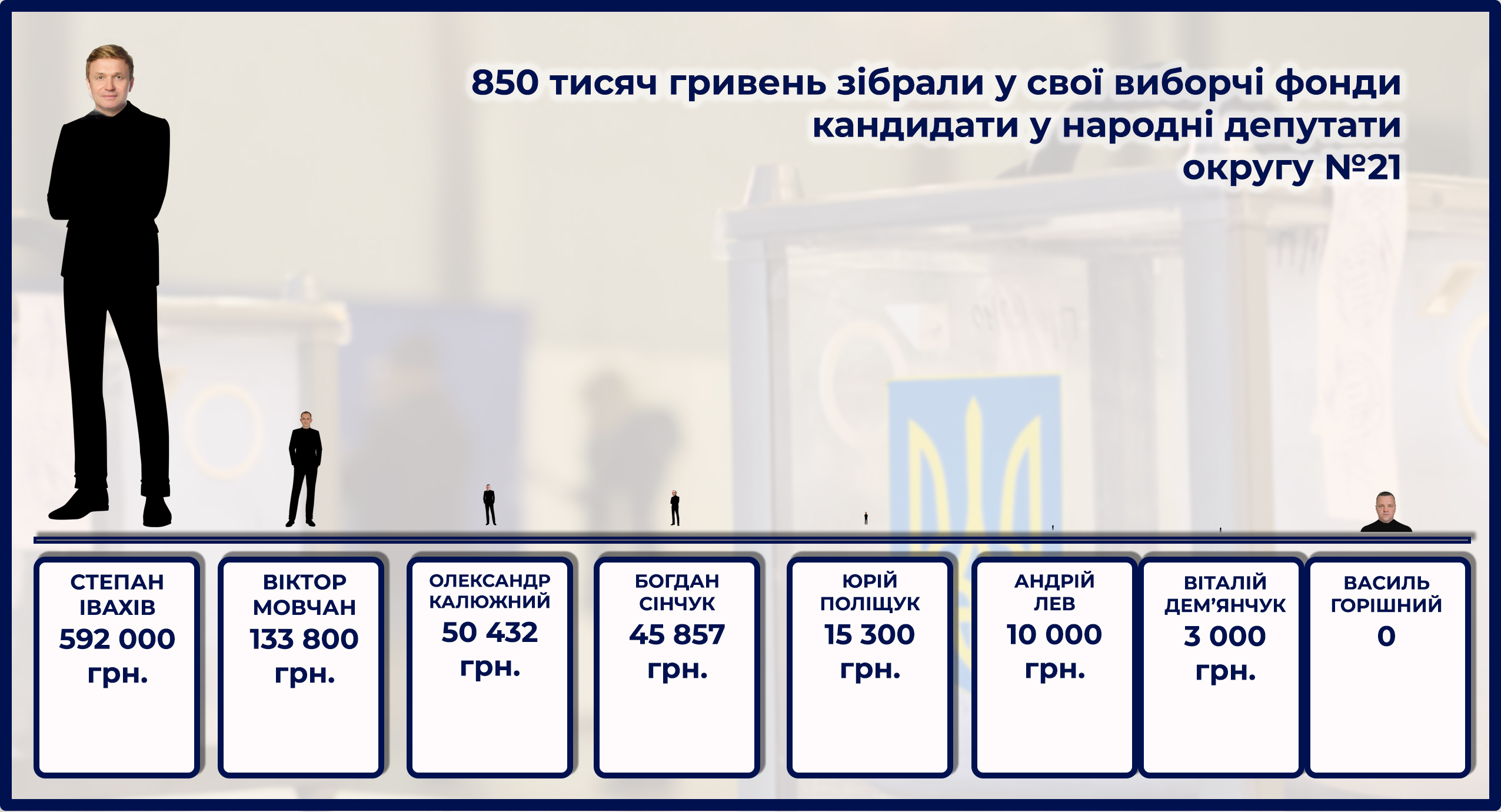 Найбільше на свій виборчий рахунок перерахував народний обранець двох попередніх скликань Верховної Ради Степан Івахів – 592 тисячі гривень. Майже 133 тисячі гривень – у керівника благодійного фонду «Позитивна взаємодія», самовисуванця Віктора Мовчана. Решта кандидатів мали скромні виборчі бюджети – до 50 тисяч гривень.