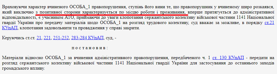 Наприклад, колишній учасник АТО, а нині безробітний мешканець Ківерців Олександр Кууток сам звернувся до суду з проханням передати матеріали про правопорушення на розгляд колективу військової частини. Найцікавіше, що серед пом’якшуючих обставин врахували позитивну характеристику з місця роботи, хоча і статус безробітного теж взяли до уваги. Назустріч порушнику суд пішов, тож п’яного водія будуть «перевиховувати» співробітники військової частини Нацгвардії.