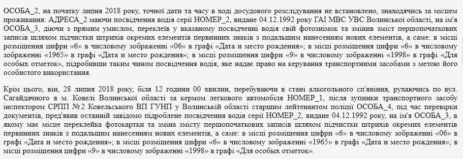 За даними реєстру «Судова влада України», ця особа притягується до відповідальності з невтішною регулярністю. Безпосередньо за це керування напідпитку під іменем батька він отримав штраф в розмірі 10 200 гривень з позбавленням водійських прав, ще 1700 довелось заплатити за маніпуляції з посвідченням. В день здійснення вищезгаданого порушення, тільки на дві години раніше, водій, вже будучи п’яним, намагався «підрізати» іншу автівку, але не впорався з керуванням і в’їхав у неї, після чого втік з місця ДТП, за що згодом його оштрафували на 340 гривень.