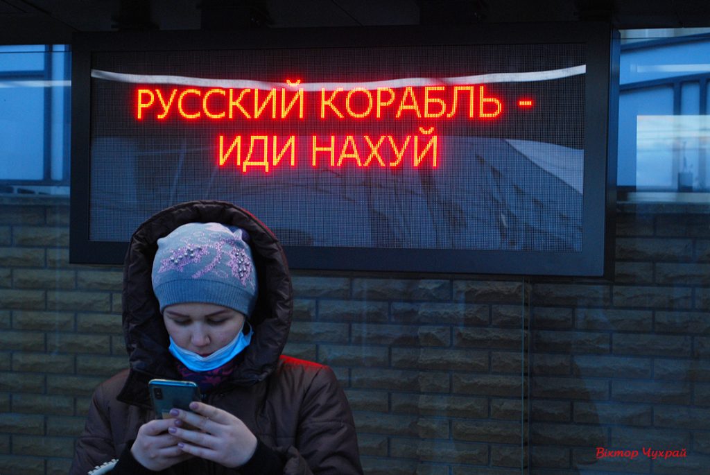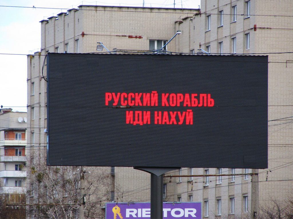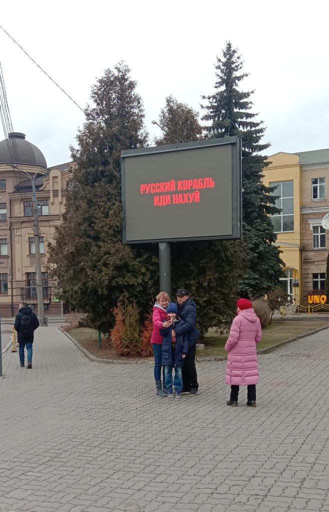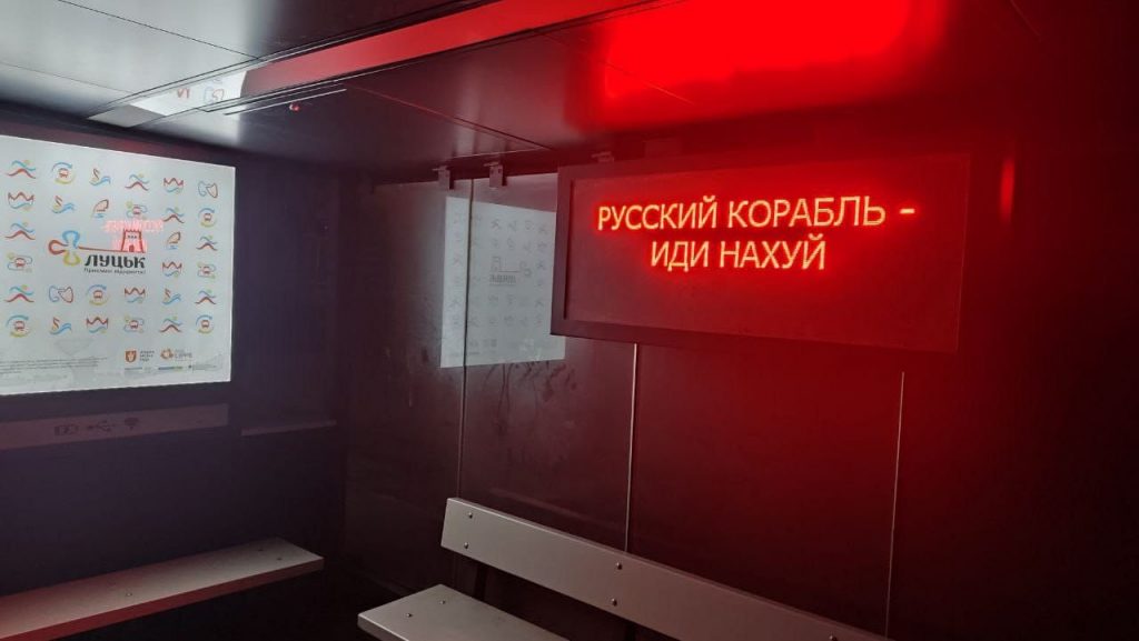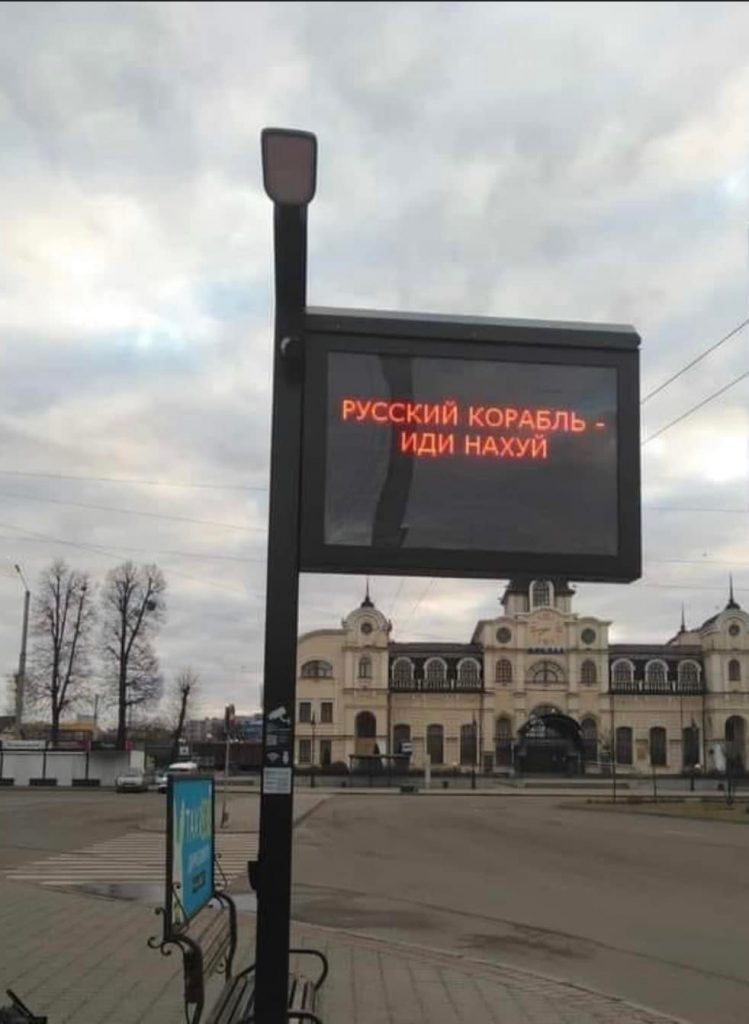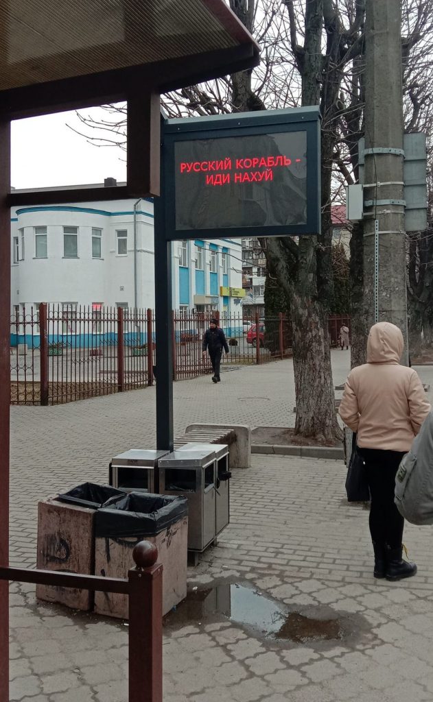 10.55 год. У Луцьку на табло «розумних зупинок» тепер замість маршрутів громадського транспорту відображено гасло «Русский корабль – иди нахуй». Надпис з’явився учора, 27 лютого. Нагадаємо, такою була відповідь героїв-прикордонників російським окупантам, які під час облоги острова Зміїний пропонували захисникам здатися. Схоже, відповідь героїв стала національним гаслом спротиву агресору.