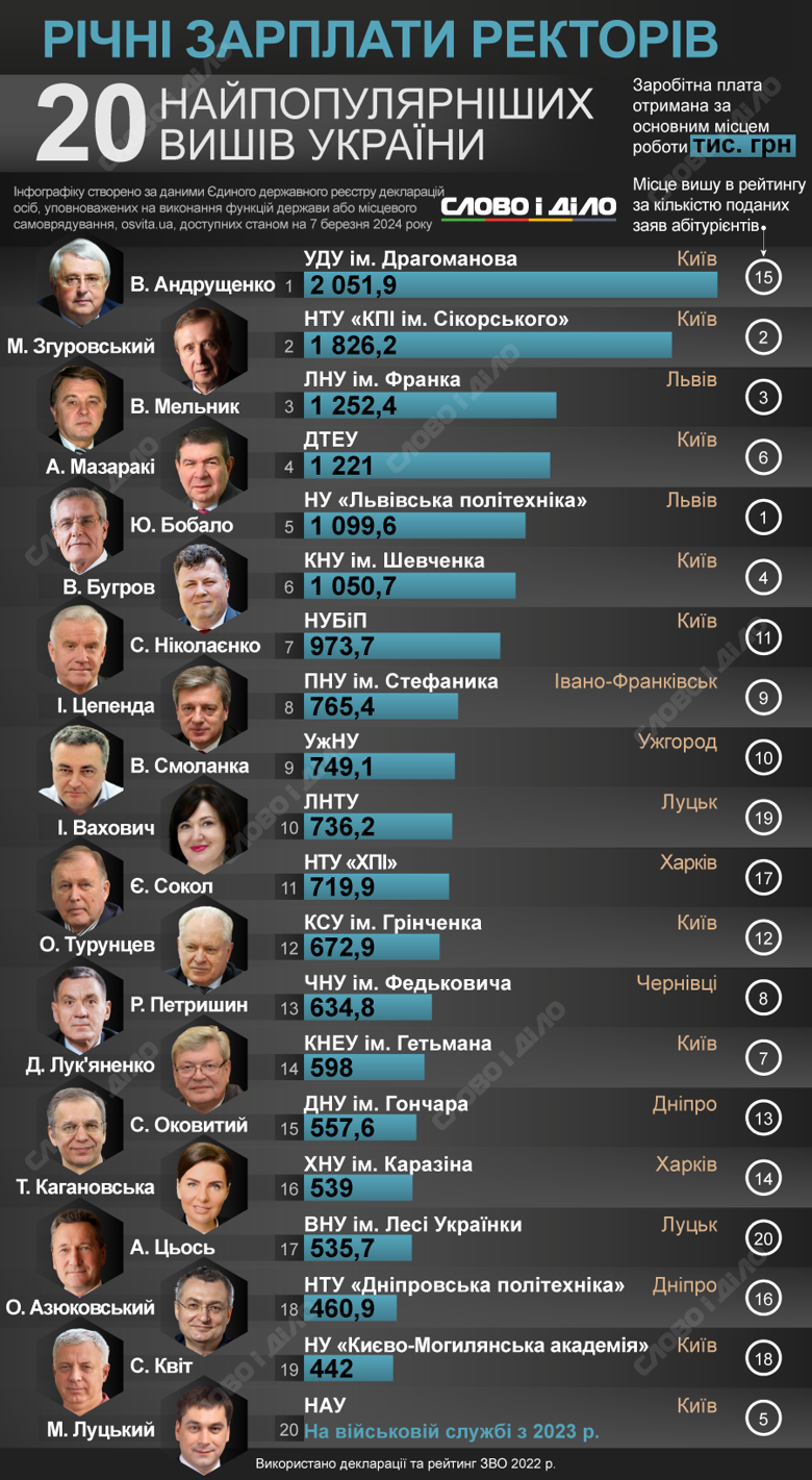 До рейтингу увійшли 20 керівників закладів вищої освіти України, які мають найбільшу популярність у абітурієнтів. Популярність навчальних закладів визначали за кількістю поданих заяв до ВНЗ у 2022 році. Зарплату ректорів цих вишів теж оцінювали за 2022 рік.