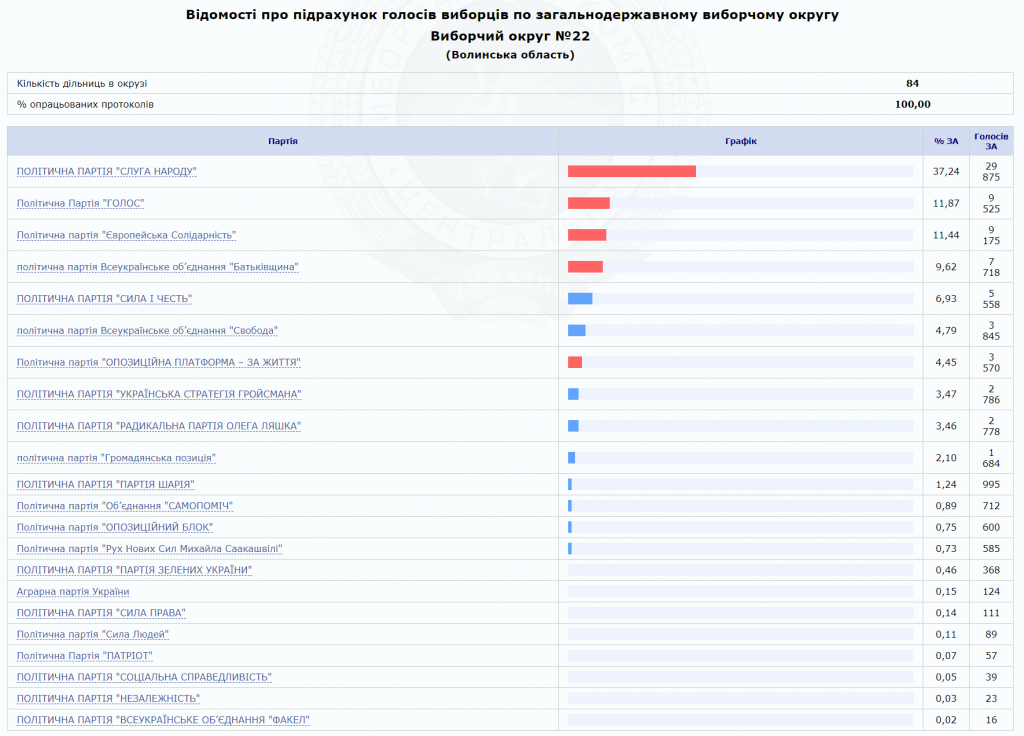 До слова, «Слуга народу» в Луцьку отримала перемогу на всіх дільницях крім однієї. На дільниці №071070 в Луцькому геріатричному пансіонаті з невеликим відривом перемогу здобула «Радикальна партія Олега Ляшка», проте до Верховної Ради радикали все ж не потраплять.
