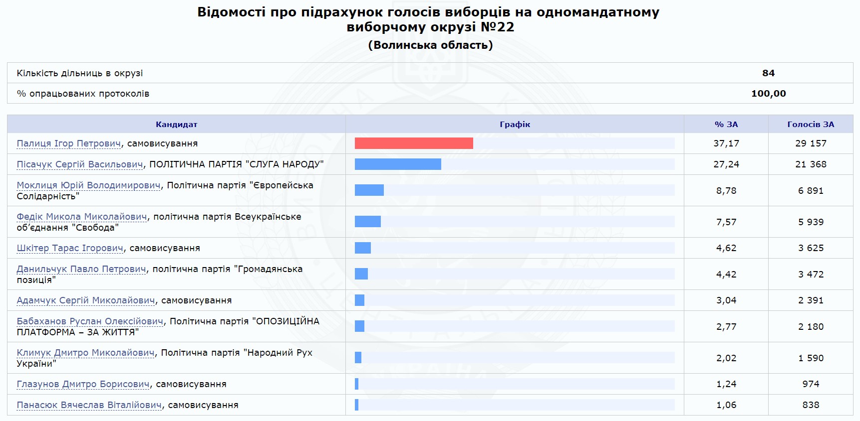 ЦВК опрацювала 100% протоколів із виборчих дільниць в 22 виборчому окрузі (місто Луцьк). Серед партій найбільшу підтримку здобула партія «Слуга народу», а серед кандидатів-мажоритарників – нинішній голова Волинської обласної ради Ігор Палиця.