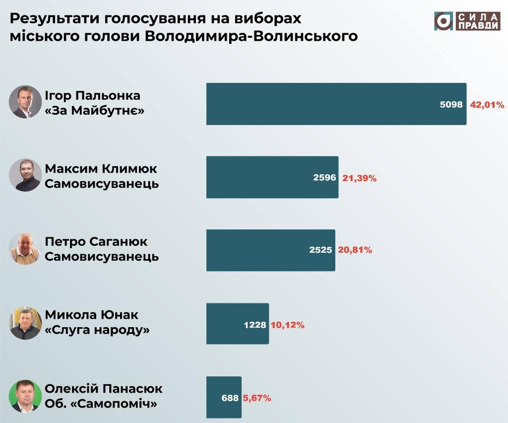 Загалом за кандидатів на посаду міського голови Володимира-Волинського належно проголосували 12 135 виборців. Найбільше голосів (5098, що становить 42,01%) віддали за Ігоря Пальонку.