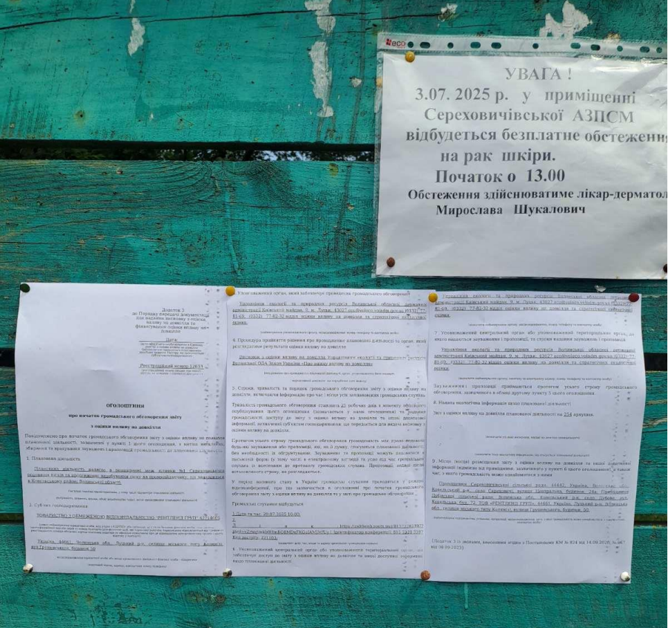 До слова, на сайті Сереховичівської громади оголошення про громадські слухання, станом на 11 липня, – немає. Втім, воно у паперовому виді розміщене на дошках оголошень у прилеглих селах. Щоправда, як охочі зможуть приєднатися до онлайн зустрічі за посиланням, яке надруковане на папері, – незрозуміло.
