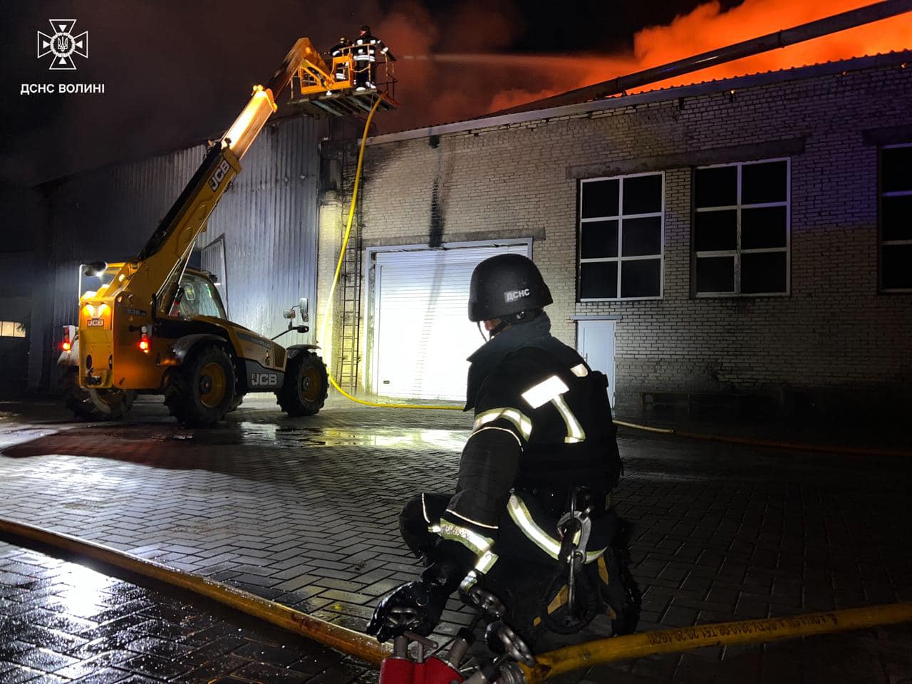 «Рятувальники підрозділів ДСНС Волині виїжджали на ліквідацію наслідків ворожого обстрілу. Зокрема підрозділи служби 101 з міста Луцька та Ківерці, а також вогнеборці місцевої пожежної охорони селища Цумань ліквідували пожежу на підприємстві у Луцькому районі. Площа пожежі на момент прибуття підрозділів служби 101 складала 1000 м квадратних. Вогнеборці працювали над гасінням пожежі декілька годин, подавши на приборкання вогню водяні стволи з різних напрямків, в тому числі із застосуванням пожежної автодрабини та допоміжних технічних засобів. Від вогню вдалось врятувати сусідні будівлі та майно. Ліквідували пожежу вранці, на щастя постраждалих немає, збитки встановлюються».