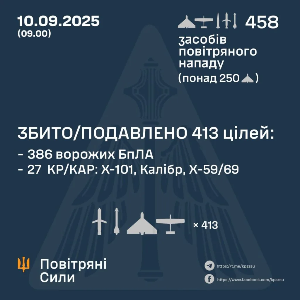 За попередніми даними, станом на 09.00, протиповітряною обороною збито/подавлено 413 повітряних цілей: