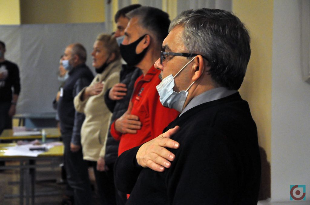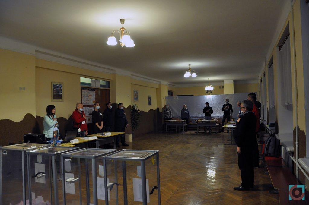 Коли голова комісії зачиняє двері, майже всі корінці підраховано. Та спершу всіх просять стати по периметру приміщення. Секретарка ДВК Анна Полухтович вмикає гімн України. Урочиста мить завершення голосування.