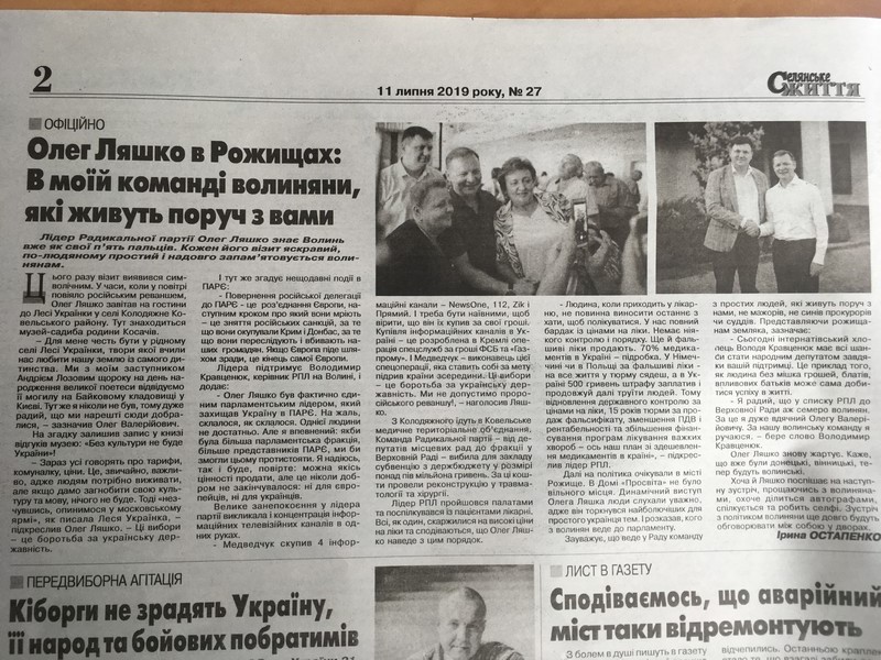 Радикальна партія Олега Ляшка на Волині прорекламувалася на 550 тисяч гривень. «Радикали» «засівали» на місцевих приватних телеканалах «Аверс» та «12 канал», обласних газетах «Волинь» та «Вісник+К», а також у п’ятнадцяти міських і районних газетах.