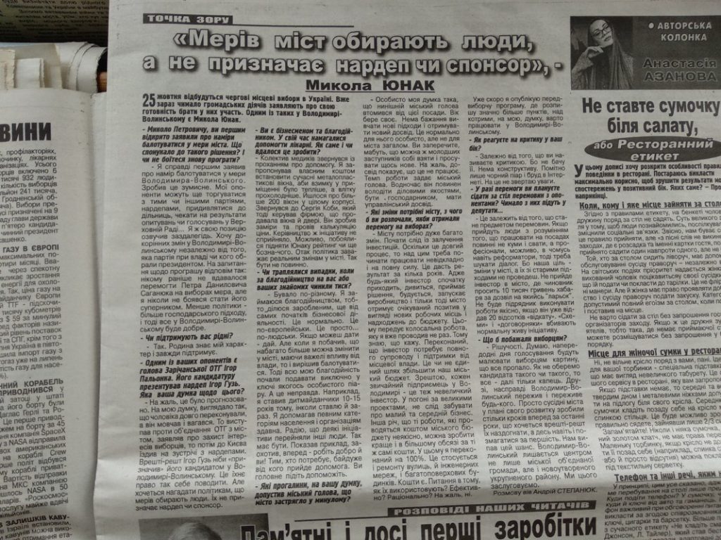 Зокрема, у Володимир-Волинській газеті «Слово правди» від 6 серпня опублікували інтерв’ю із потенційним кандидатом від партії «Слуга народу» Миколою Юнаком, який заявив про балотування ще у липні. Публікація має назву «Мерів міст обирають люди, а не призначає нардеп чи спонсор», – Микола Юнак». У ній потенційний кандидат висловлює свою позицію щодо низки питань, а також розмірковує про свої дії у разі перемоги на виборах.