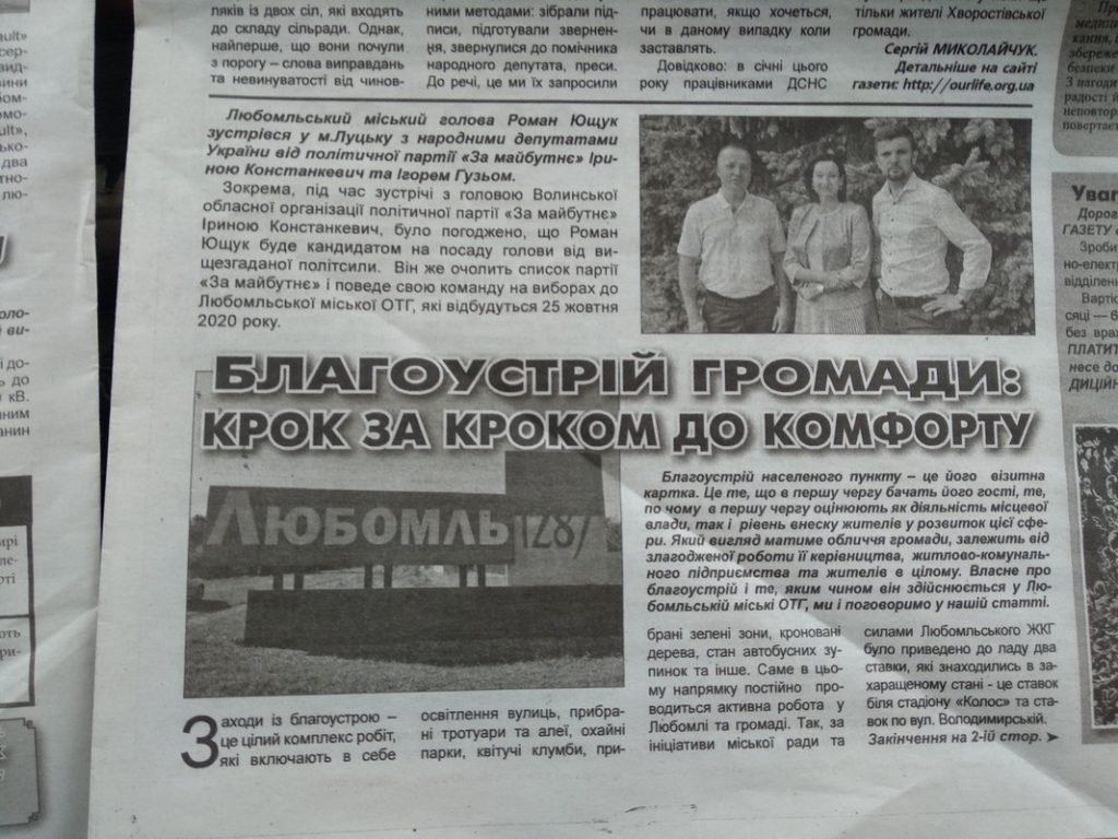 У Любомльській громадсько-політичній газеті «Наше життя» від 7 серпня вийшла публікація «Благоустрій громади: крок за кроком до комфорту». У ній згадується, що чинний голова ОТГ Роман Ющук балотуватиметься від партії «За майбутнє» на цю ж посаду. Народні депутати Ігор Гузь та Ірина Констанкевич зазначені тут як «від політичної партії «За майбутнє».