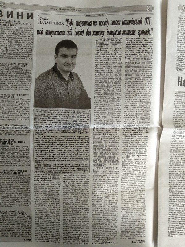 В Іваничівській районній газеті «Колос» за 13 серпня розміщене інтерв’ю «Буду висуватися на голову Іваничівської ОТГ, щоб використати свій досвід для захисту інтересів жителів громади», марковане зірочкою. У ній повідомляють про намір Юрія Лазаренка боротися за крісло очільника громади. У тексті йдеться про успіхи потенційного кандидата на посаду керівника Нововолинського наукового ліцею-інтернату, а також бачення щодо вирішення певних проблем громади.