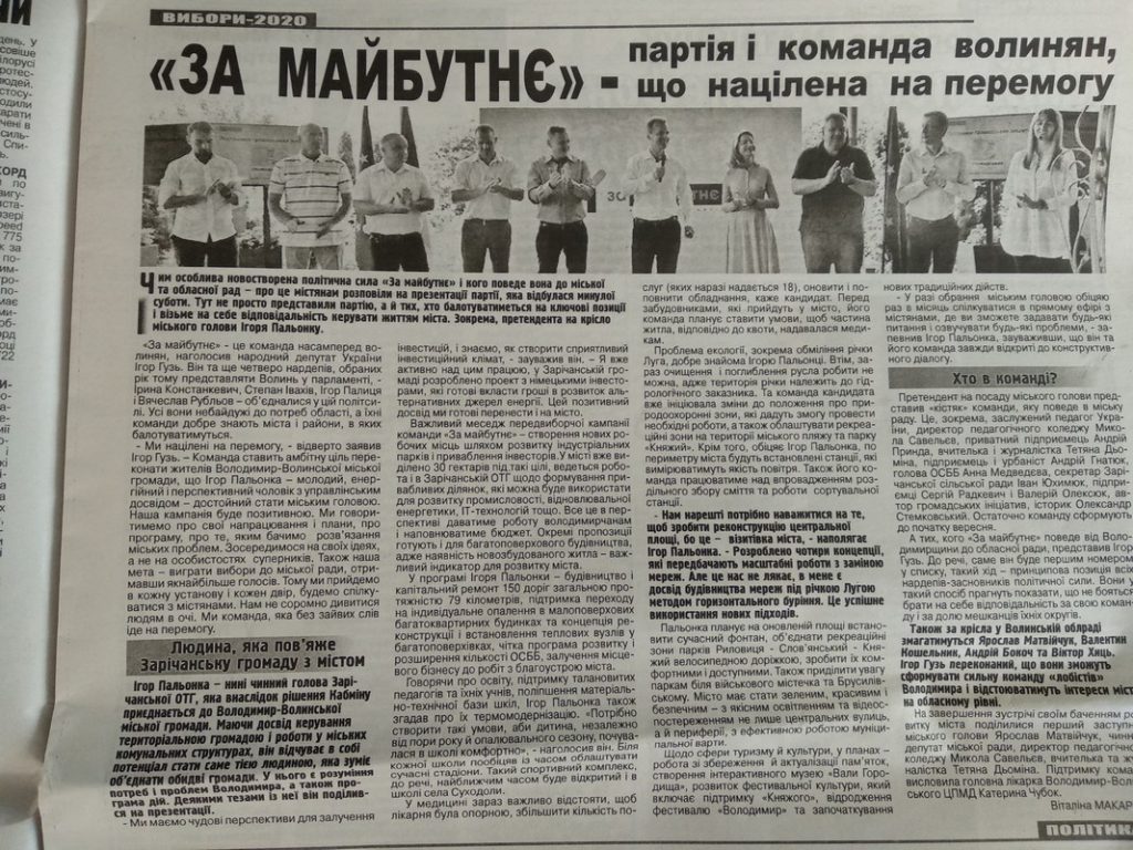 У Володимир-Волинській газеті «Слово правди» за 20 серпня з’явилася публікація «За майбутнє» – партія і команда волинян, що націлена на перемогу». У ній розповідають про те, хто у команді партії, про потенційного кандидата на посаду міського голови Володимира-Волинського Ігоря Пальонку та його плани, а також зазначають, що чинні волинські нардепи приєдналися до сили та балотуватимуться в своїх округах.