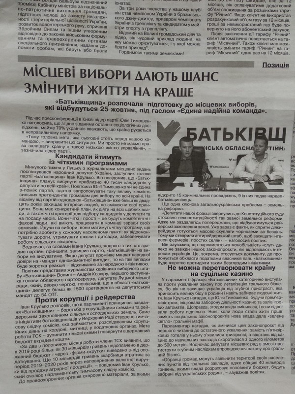 Низка публікацій про те, що на вибори йде партія «Батьківщина», теж з’явилася у газетах наприкінці серпня. У них цитують лідерку партії Юлію Тимошенко та розповідають про пресконференцію нардепа Івана Крулька у Луцьку, а також про роботу фракції «Батьківщини» у парламенті. Публікації із заголовками «Місцеві вибори дають шанс змінити життя на краще» з’явилися 20 серпня у Камінь-каширській районній газеті «Полісся», Рожищенській районній газеті «Наш край», Любешівській «районці» «Нове життя», «Горохівському віснику», та 21 серпня – у газеті «Ратнівщина».