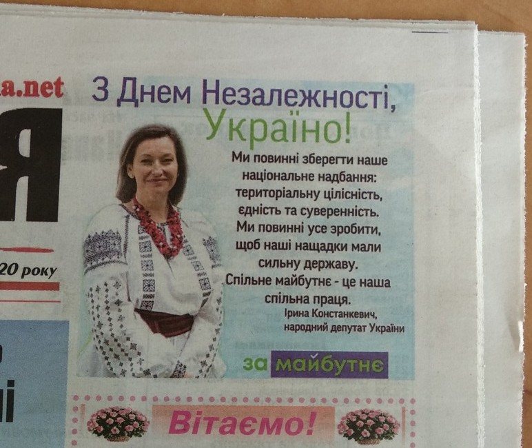 У газетах «Нова доба» та «Нове життя» 13 серпня та у газеті «Полісся» за 17 серпня цілу шпальту зайняла інформація зі звітуванням нардепки Ірини Констанкевич. Тут вказано, що вона є членкинею депутатської групи «Партія «За майбутнє», а також є логотип відповідної Партії. Окрім того, аналогічний логотип міститься під привітанням нардепки із Днем Незалежності на перших шпальтах газет «Полісся» та «Нове життя».
