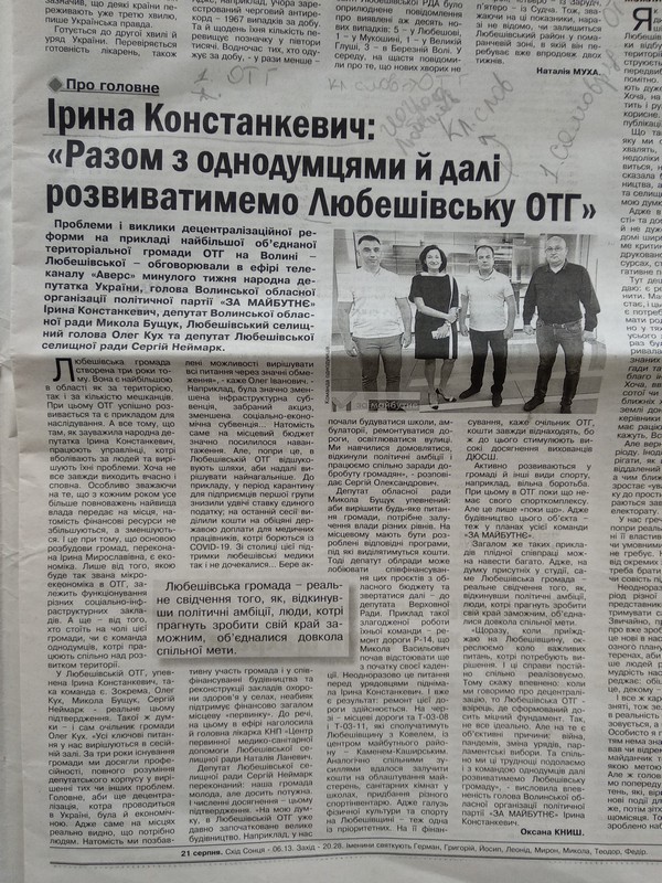 Окрім того, у газеті «Нове життя» від 20 серпня з’явилася публікація «Ірина Констанкевич: разом із однодумцями надалі розвиватимемо Любешівську ОТГГ». У ній зазначають, що народна депутатка є головою Волинської обласної організації політичної партії «За майбутнє». Окрім того, у матеріалі зазначено, що будівництво нового спорткомплексу – «теж у планах усієї команди «За майбутнє».
