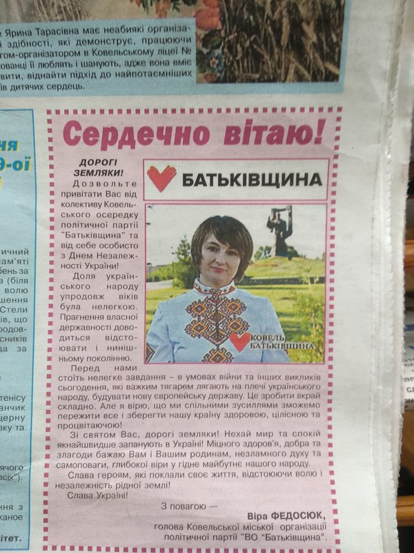 У газеті «Вісті Ковельщини» за 20 серпня з’явилося привітання очільниці міського осередку ВО «Батьківщина» Віри Федосюк, ілюстроване логотипом партії. У ньому Віра Федосюк мешканців Ковельщини вітає з Днем Незалежності від себе та від Ковельського районного осередку партії.