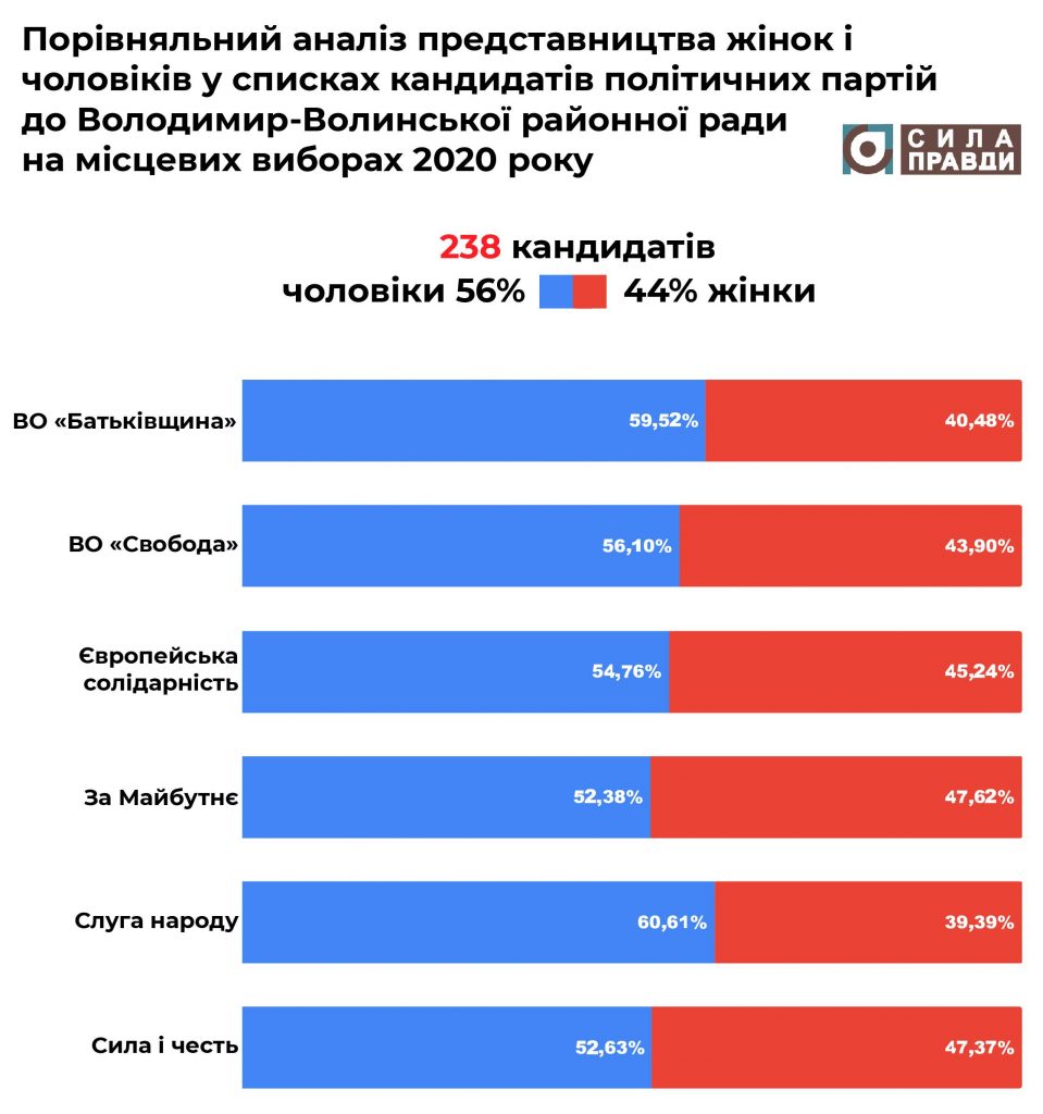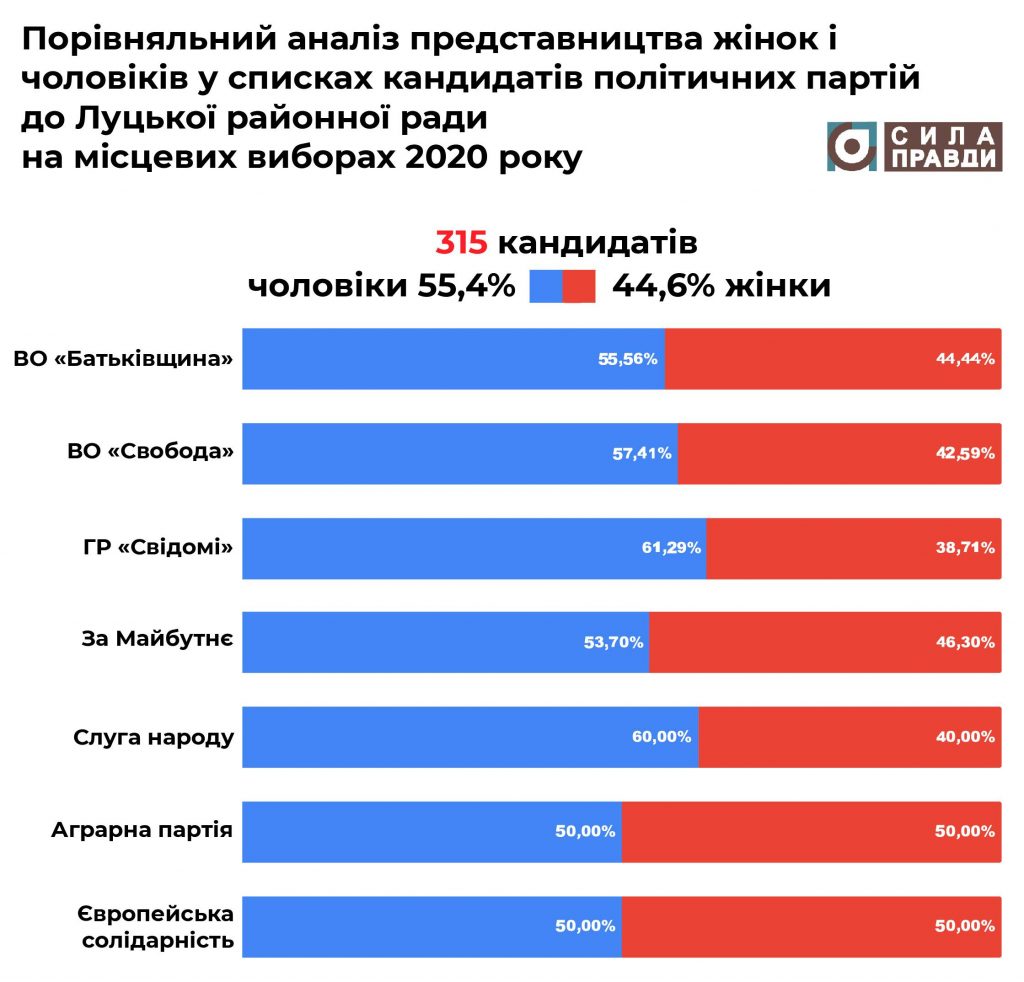 «Сила правди» не виявила порушення законодавства в частині гендерних квот при формуванні списків усіх партій, що балотуються до Луцької районної ради. ТВК зареєструвала 7 партій, до їхніх списків увійшло 315 кандидатів. 55,4% чоловіків і 44,6% жінок. Аграрна партія і партія «Європейська солідарність» сформували списки, де жінок і чоловіків порівну. Партія «Громадянський рух «Свідомі» натомість не дотягнула до 40% жіноцтва у списку. Але, якщо аналізувати кожну п’ятірку, то необхідний мінімум, по дві кандидатки, таки забезпечили.