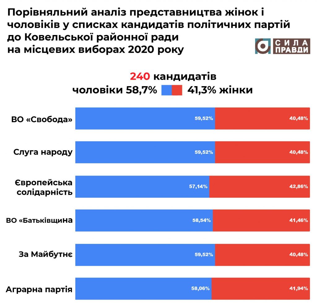 На вибори Ковельської районної ради йдуть 6 партій, що внесли в свої списки 240 кандидатів і кандидаток. Аграрна партія України хоч і забезпечила понад 40% жінок у єдиному списку та в третій його п’ятірці – четверо чоловіків і одна жінка. Невідповідностей щодо пропорційного почергового включення осіб різних статей у виборчі списки інших партій не виявлено. Найбільше жінок у списку «Європейської солідарності». Жодна з партій, що балотуються до Ковельської райради, не поставила першим номером жінку.