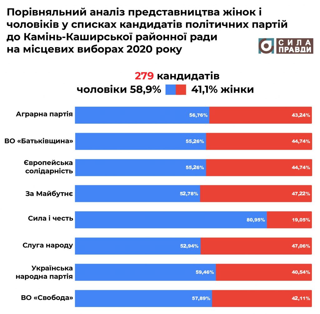 До речі, жінки стали першими номерами у єдиних списках Аграрної партії України, партій «Сила і честь» та «Слуга народу» до Камінь-Каширської районної ради. Найбільше жінок у відсотковому співвідношенні висунули до цієї ради «Слуга народу» та «За Майбутнє».