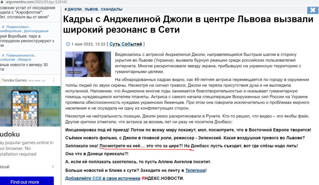 Наприкінці квітня 2022 року відома голлівудська акторка Анджеліна Джолі приїхала до Львова, де побувала у кафе в одному з районів Сихова, а також встигла відвідати поранених дітей та волонтерів. Натомість, у соцмережі Facebook польською мовою «розганяли» повідомлення, що війна в Україні – це «цирк». А початок таких слів береться із російських сайтів. Ось наприклад тут.
