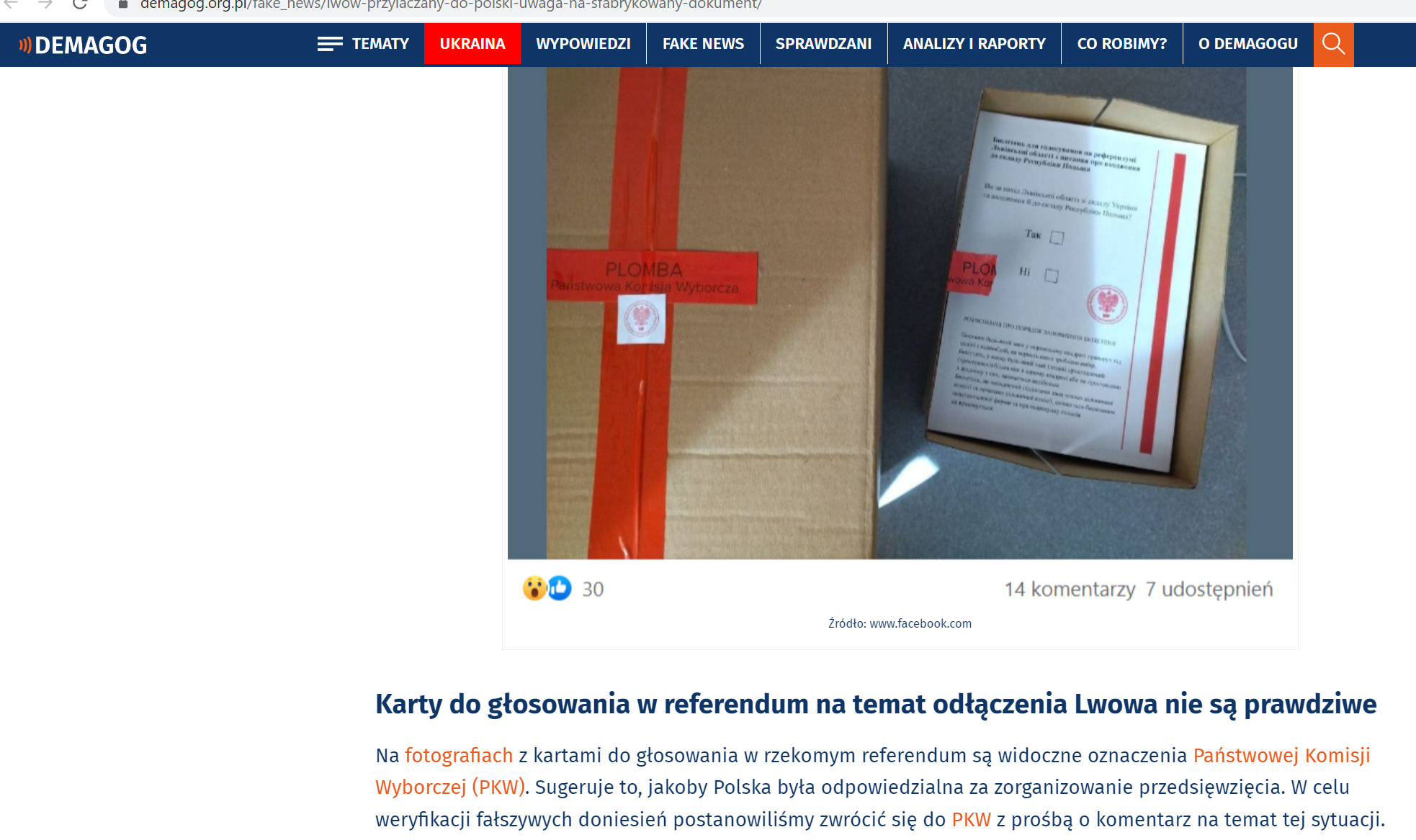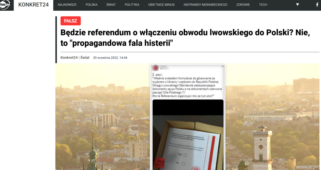Також у соцмережах польською мовою поширювали інформацію про «приєднання» Львова до Польщі. У Facebook наводили несправжні «документи» щодо такого референдуму. Наприклад, про цей фейк писали «Demagog» та «Konkret.24».