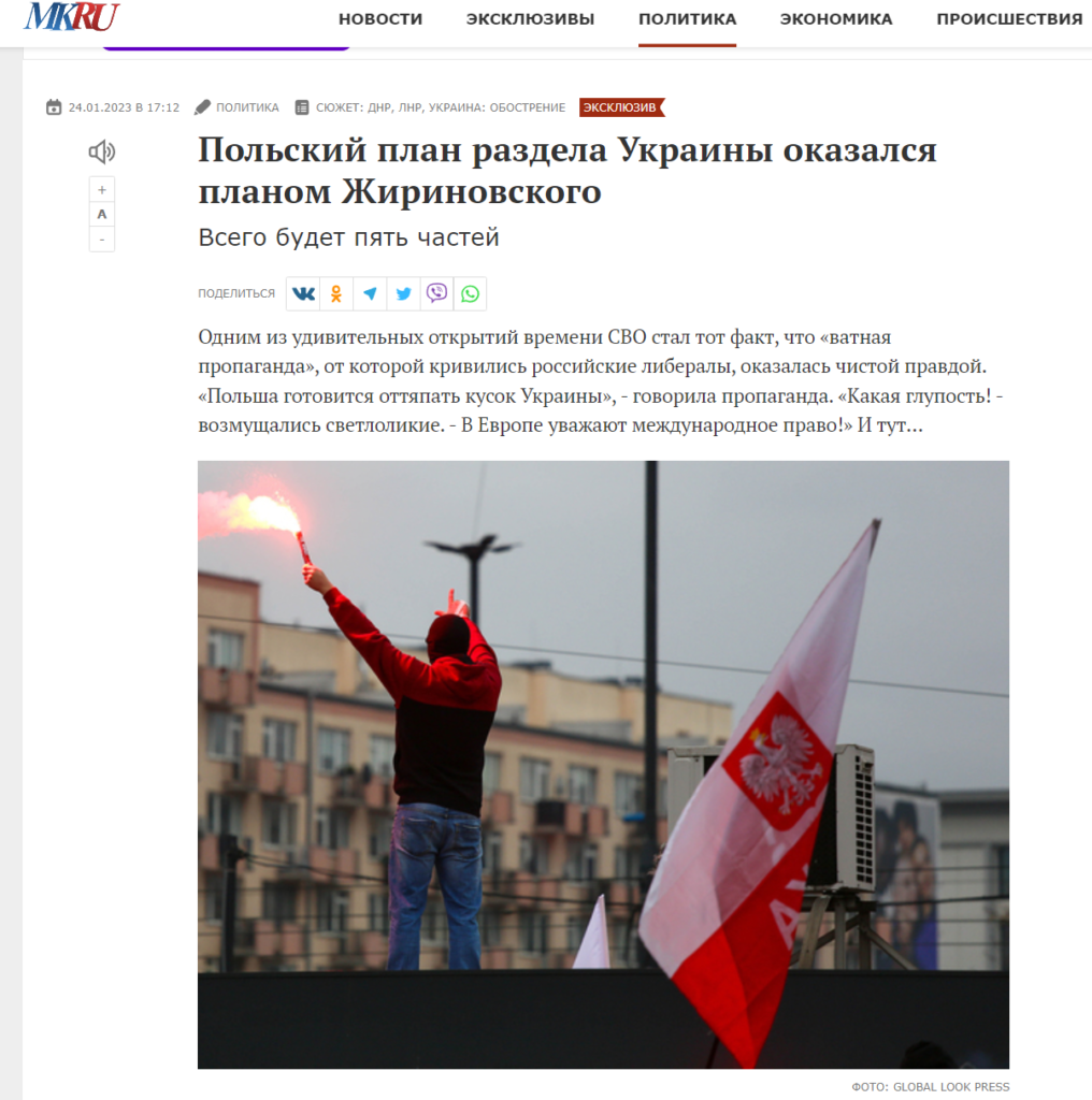 На російських сайтах досі є й цьогорічні фейкові новини, що план «розподілу» України виявився планом Жириновського. На подібних сайтах часто пишуть маячню і складається враження, що самі ж вірять у написане.