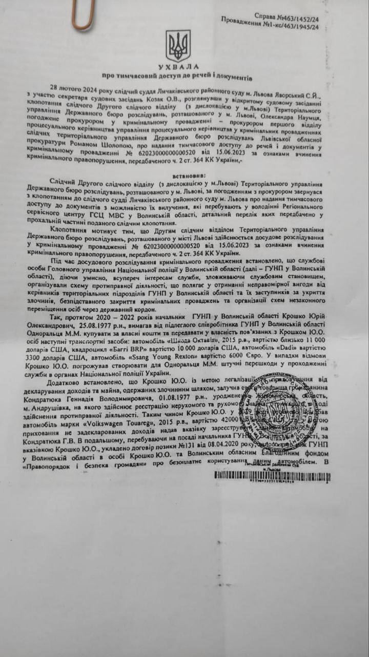 За кілька тижнів у мережі з’явилося фото ухвали, яку ймовірно виніс Личаківський районний суд Львова. В документі йдеться про кримінальне провадження, де нібито фігурують головний поліцейський області Юрій Крошко та керівниця Первинної профспілкової організації Головного управління Нацполіції у Волинській області Наталія Горошко.