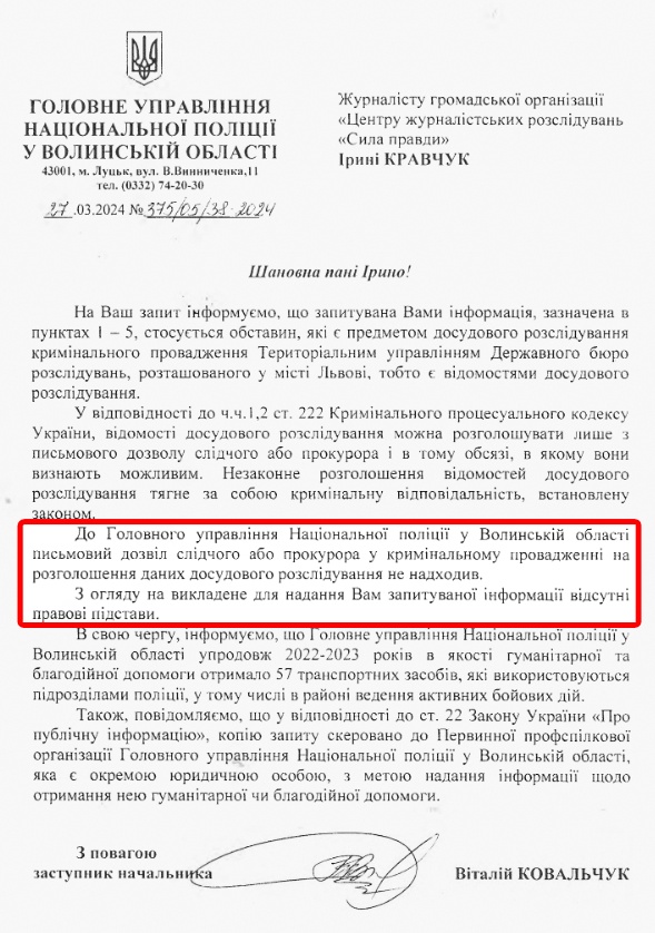 «Сила правди» надіслала запит до Головного управління Національної поліції у Волинській області з проханням надати копії укладених із благодійним фондом договорів позики. Втім там послалися на заборону розголошення будь-яких матеріалів кримінального провадження і відмовили.
