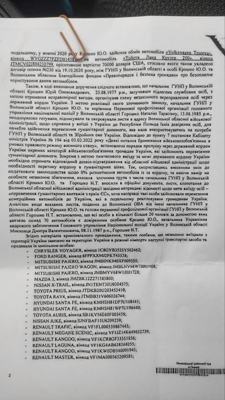 Другий епізод в провадженні стосується автомобілів, які начебто використовував начальник поліції впродовж 2020-2022 років. Згідно з ухвалою, яку виніс Личаківській районний суд, Крошко нібито реєстрував їх на свого товариша Геннадія Кондратюка з Андрушівки Житомирської області, щоб приховати від декларування.