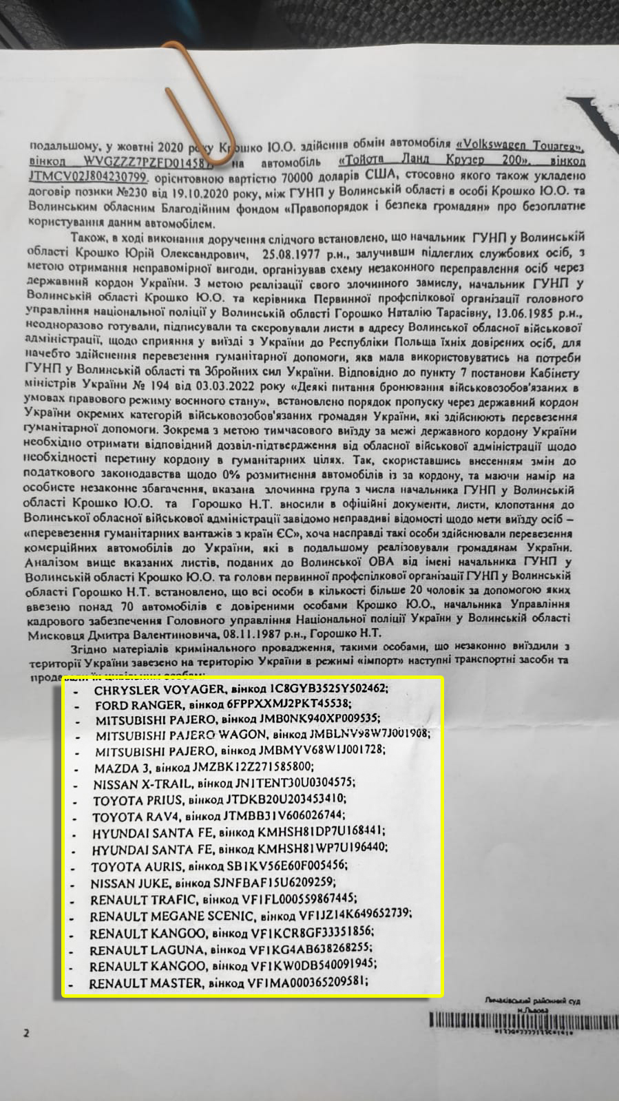 Ще сім автомобілів, про які йдеться в ухвалі Личаківського районного суду, упродовж 2022 року були імпортовані з-за кордону та поставлені на облік в різних регіонах: дві у Рівненській області (Renault Trafic, Renault Kangoo), чотири на Волині (Toyota RAV4, Toyota Auris, Chrysler Voyager, Mazda 3) та одна в Києві (Nissan Juke). Де наразі перебувають ці авто – невідомо.