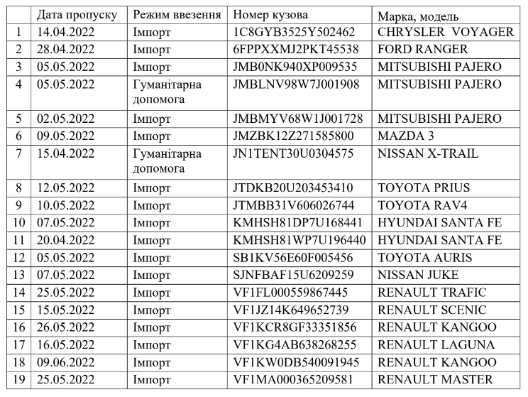 На Волинській митниці «Силі правди» повідомили, що всі вказані транспортні засоби були ввезені на територію України з квітня по травень 2022 року. Лише два з них мали статус гуманітарної допомоги. Йдеться про Nissan X-Trail та Mitsubishi Pajero поставлені на тимчасовий державний облік у Волинській та Київській областях у 2022 році.