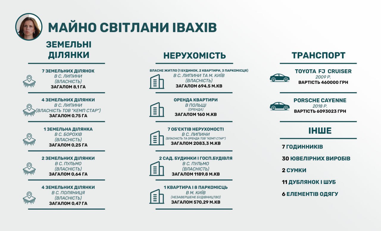 Крім майна у Липинах Світлана Івахів офіційно має у власності 75 соток землі у селі Хотянівка на Київщині, 46 соток у селі Поляниця Івано-Франківської області, 25 соток у селі Борохів та 63 сотки у Пульмо на Волині. У Пульмо, зокрема, вона також володіє господарською будівлею на 656,2 квадрата та двома садовими будинки. Площа одного з них становить 307,6 квадратів, а його вартість складає 1,3 мільйона гривень.