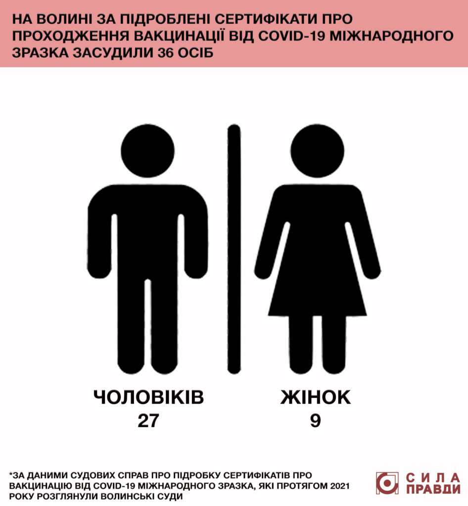 У 2021-му році волинські суди винесли 36 вироків у справах про використання підроблених сертифікатів вакцинації від Covid-19. Серед фігурантів цих справ 9 жінок і 27 чоловіків.