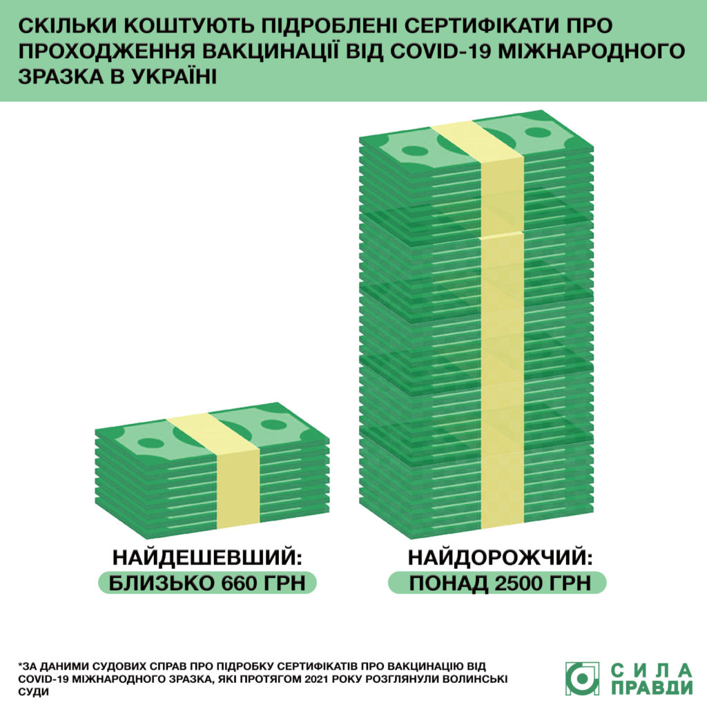 Не у всіх вироках вказано суму, за яку порушники придбали підроблені сертифікати. Однак вартість таких послуг почала зростати. Влітку-на початку осені 2021-го несправжні сертифікати коштували від 660 і до 1800 гривень, пізніше за них вже брали від 2 тисяч гривень.