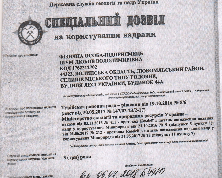 Цікаво, що спецдозвіл на користування надрами з метою геологічного вивчення пісків в якості будівельної сировини на зазначених ділянках Туропинського родовища №1,2,3,4,5 і 6 видавався 71-річній Любові Шум з села Головне Любомльського району, а документи на проведення оцінки впливу на довкілля на ці ж ділянки подало ТОВ «Рентленд груп».
