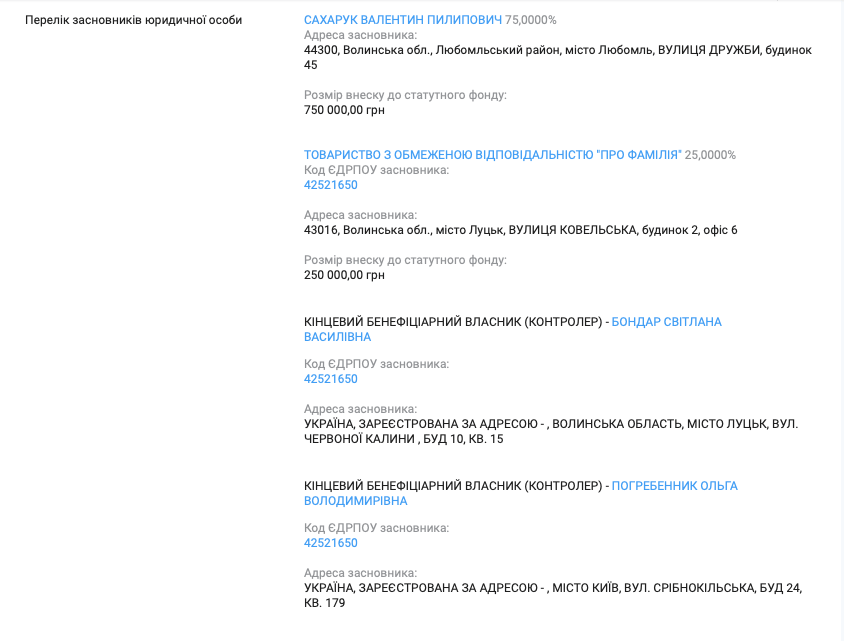 За даними аналітичної системи «YouControl», співзасновниками і кінцевими бенефіціарами компанії є ТОВ «Про Фамілія» (співвласники Світлана Бондар та Ольга Погребенник – відповідно дружина і донька заступника голови Держлісагентства України Володимира Бондаря), та мешканець Любомля Сахарук Валентин Пилипович, який володіє контрольним пакетом акцій.