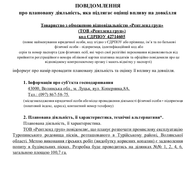 ТОВ «Рентленд груп» «з’явилося на світ» за 19 днів до того, як подали документи в Мінекології для оцінки впливу на довкілля майбутнього піщаного кар’єру, а саме – 20 грудня 2018 року.