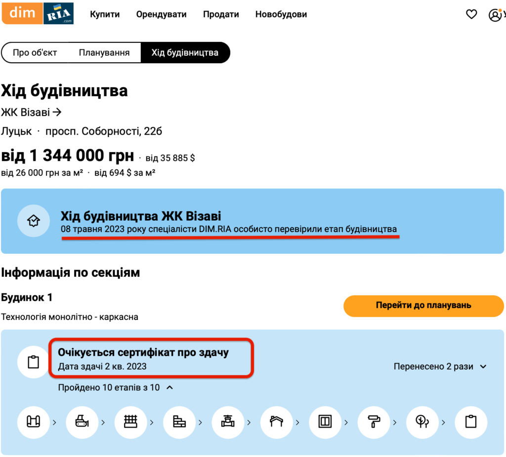На сайті «Dim.Ria» пишуть, що 8 травня 2023 року їхні спеціалісти особисто перевірили стан будівництва, а також прогнозують, що відповідний сертифікат «Візаві» отримає у другому кварталі 2023 року.